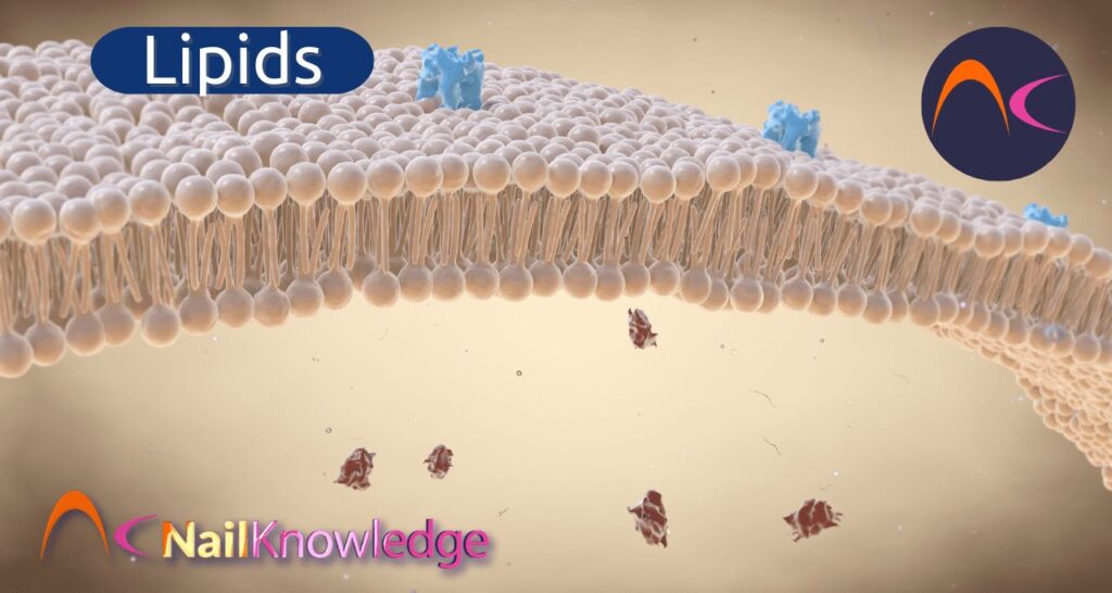 Lipids are molecules that contain hydrocarbons and make up the building blocks of the structure and function of living cells. Lipids are in all living cells. In the nail plate during the process of keratinisation where the living cells loose all their cellular contents to be replaced by keratin, the lipids are pushed out and form an efficient protection and lubrication between the nail plate cells. These can be lost by environmental factors and lack of them can result in brittle nails.