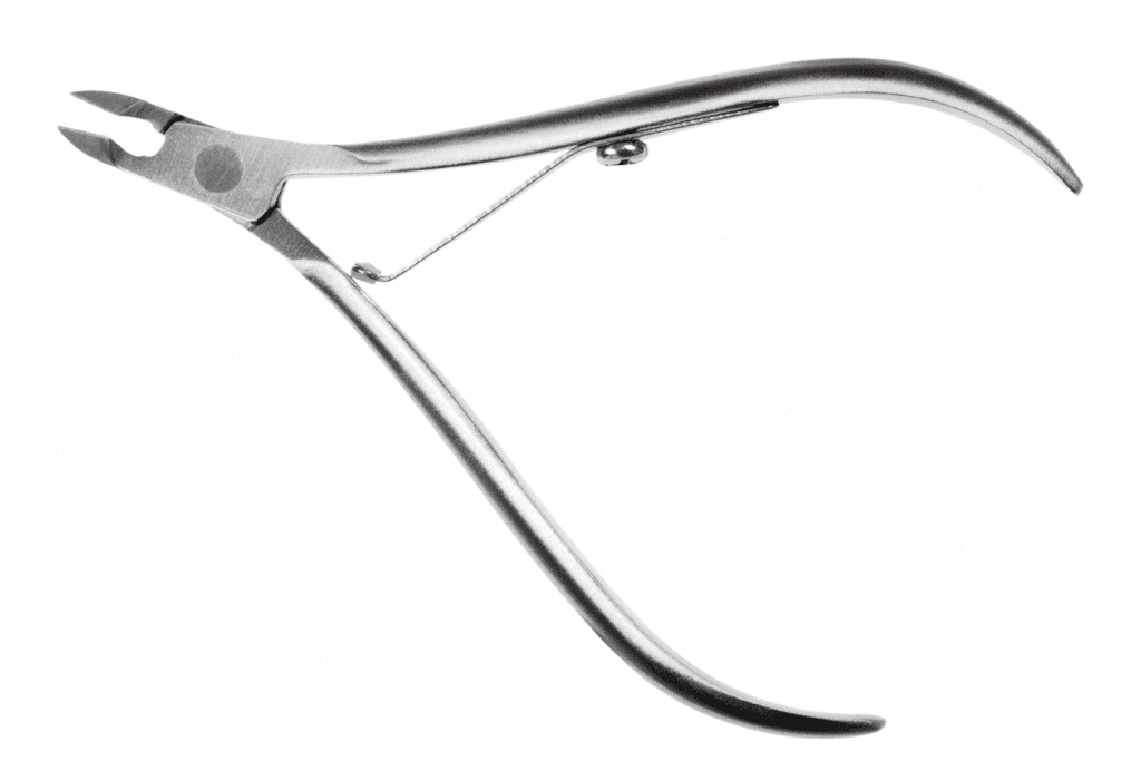 Nippers A sharp-bladed tool used to safely cut hangnails (not the living skin of the proximal nail fold!).